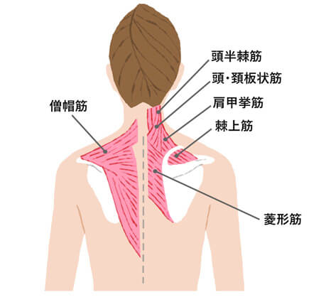肩関節の周囲にはさまざまな筋肉がありますが、肩こりの自覚症状を起こす主な筋肉は僧帽筋(特に僧帽筋上部線維)です。僧帽筋は、首の後ろから肩、背中にかけてある幅広い筋肉で、アウターマッスル(表層筋)の一つです。